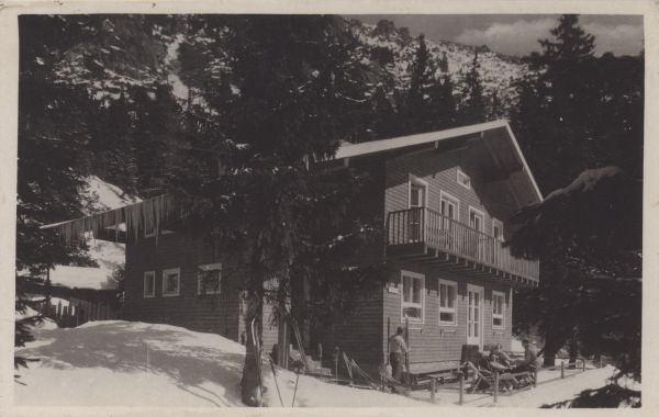 Schronisko Zamkovskiego w Dolinie Małej Zimnej Wody w zimowej scenerii. Przed budynkiem narciarze.