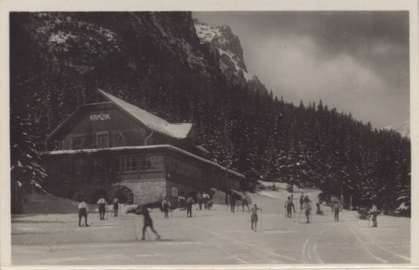 Schronisko pod Kozicą na Polanie Staroleśnej zimą. Przed budynkiem narciarze.