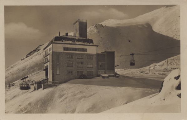 Widok na budynek stacji kolei linowej oraz hotel Encián nad Łomnickim Stawem w scenerii zimowej.