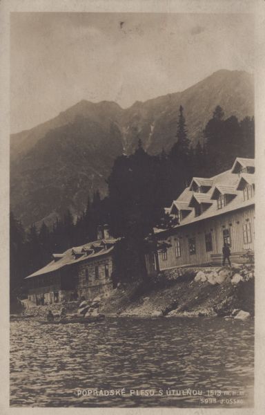 Schronisko nad Popradzkim Stawem w Dolinie Mięguszowieckiej. W tle Skrajna Baszta. Na dole zdjęcia opis: POPRADSKÉ PLESO S ÚTULŇOU 1513 m n. m. oraz J. Ossko.