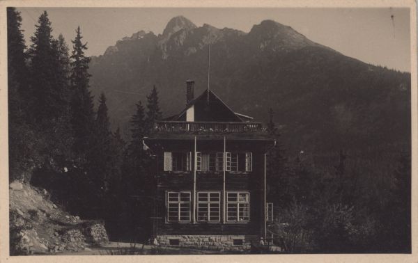 [Bilíkova chata pod Hrebienkom. V pozadí Lomnický štít.]