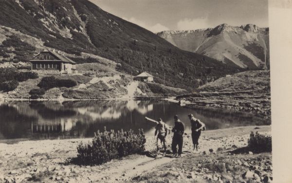 Schronisko przy Zielonym Stawie Kieżmarskim. W tle Jatki. Na pierwszym planie troje turystów.