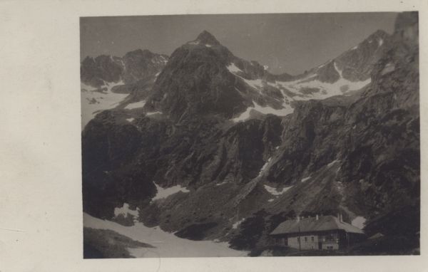 Schronisko przy Zielonym Stawie Kieżmarskim. W tle od lewej: Baranie Rogi, Czarny Szczyt, Kołowy Szczyt.