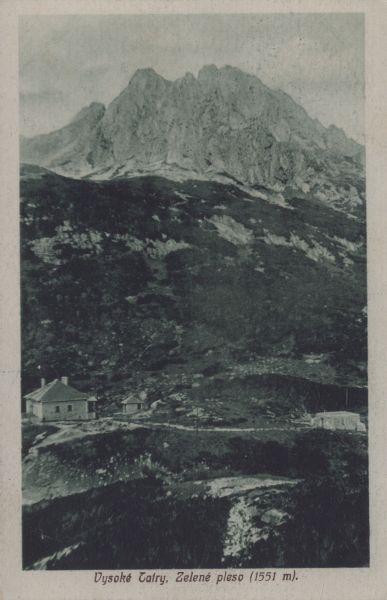 Schronisko przy Zielonym Stawie Kieżmarskim. W tle Jagnięcy Szczyt i Kozi Szczyt. Pod zdjęciem opis: Vysoké Tatry, Zelené pleso (1551 m).