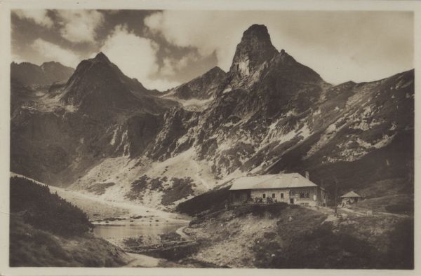 Schronisko przy Zielonym Stawie Kieżmarskim. W tle od lewej: Czarny Szczyt, Kołowy Szczyt, Jastrzębia Turnia.