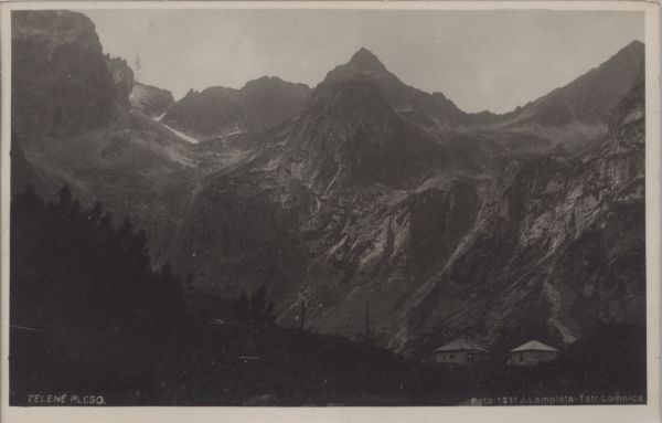 Schronisko przy Zielonym Stawie Kieżmarskim. W tle od lewej: Baranie Rogi, Czarny Szczyt, Kołowy Szczyt. Na dole zdjęcia opis: ZELENÉ PLESO. Foto - 1931 J. Lamplota - Tatr. Lomnica.