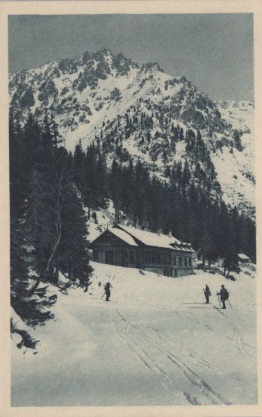 Schronisko nad Popradzkim Stawem w zimie. W tle Popradzka Kopa. Na zamarzniętym stawie widocznych troje narciarzy.