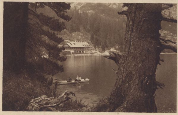 Schronisko nad Popradzkim Stawem w Dolinie Mięguszowieckiej. Na jeziorze łódź turystami.