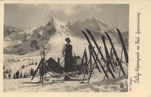 Narciarz odpoczywający na Hali Gąsienicowej w zimie. W tle Kościelec i Świnica. Na marginesie po prawej stronie wydrukowane nazwisko fotografa i tytuł.