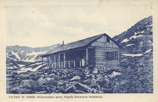 Drugie Schronisko Towarzystwa Tatrzańskiego w Dolinie Pięciu Stawów Polskich. Pod zdjęciem wydrukowany tytuł.