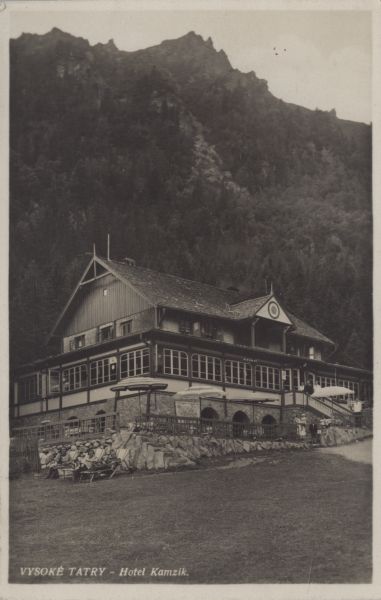 Schronisko pod Kozicą na Polanie Staroleśnej. W tle zbocza Sławkowskiego Szczytu. Na dole po lewej stronie wpisany tytuł.