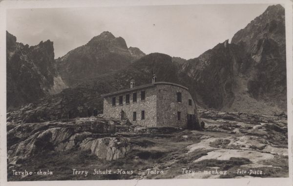 Schronisko Téryego w Dolinie Pięciu Stawów Spiskich. W tle Mały Lodowy Szczyt. Na dole wpisany tytuł, także w języku: niem. i węg. oraz nazwisko fotografa.