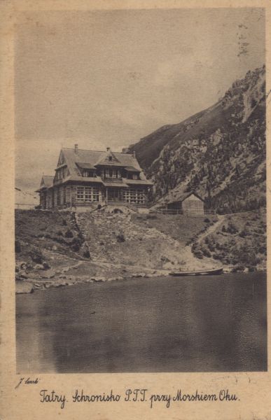 Pocztówka użyta w obiegu pocztowym, korespondencja. Dodatkowo pieczęć: "MORSKIE OKO w TATRACH 1400 m. SCHRONISKO POLSKIEGO TOWARZYSTWA TATRZAŃSKIEGO".