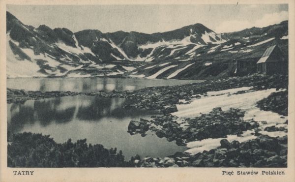 Drugie schronisko TT w Dolinie Pięciu Stawów Polskich. Na pierwszym planie Mały Staw Polski, w tle Liptowskie Mury i Gładki Wierch. Pod zdjęciem wydrukowany tytuł.