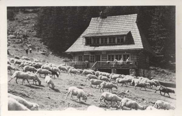 Schronisko na Hali Kondratowej. Na pierwszym planie widoczne stado owiec.