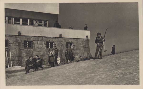 Narciarze i turyści przed hotelem na Kalatówkach w zimie.