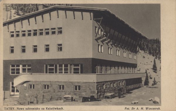 Hotel górski na Kalatówkach w zimie. Pod zdjęciem wydrukowany tytuł i nazwisko fotografa.