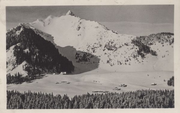 Szałasy na Polanie Kalatówki w zimie. Z lewej pod lasem widoczne schronisko. W tle Giewont.