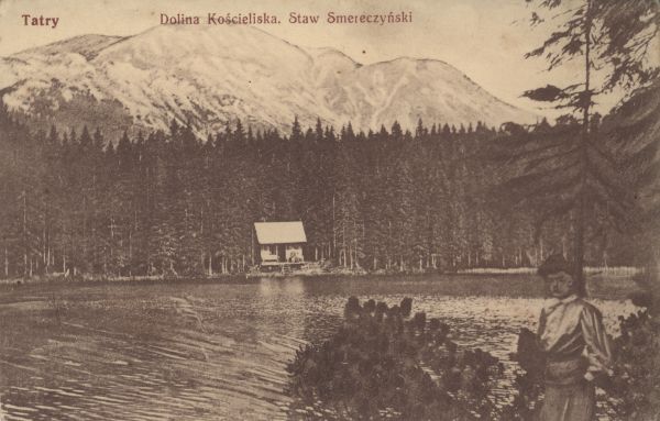 Altana nad Smreczyńskim Stawem w Dolinie Kościeliskiej. W tle Bystra. Na pierwszym planie z prawej turystka. U góry wydrukowany tytuł.