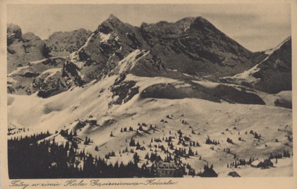 Hala Gąsienicowa w zimie. W dole widoczne schronisko. W tle Kościelec i Świnica. Pod zdjęciem wydrukowany tytuł.