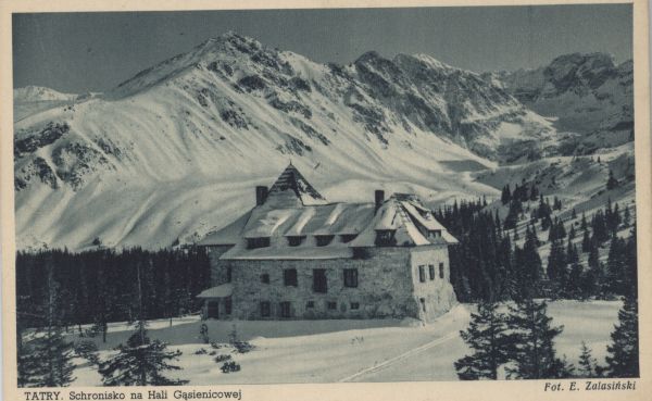Schronisko Murowaniec na Hali G±sienicowej zim±. W tle Żółta Turnia, Granaty i Kozi Wierch. Pod zdjęciem wydrukowany tytuł i nazwisko fotografa.