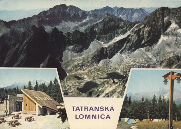 Pocztówka 3. elementowa. Na głównym zdjęciu widok z Łomnicy. Widać masyw Gerlacha w tle na obrzeżach Wysoka i Krywań. Na zdjęciu po lewej stronie bufet na autocampingu. Po prawej stronie autocamping, w tle Łomnica. Napis: TATRANSKÁ LOMNICA.