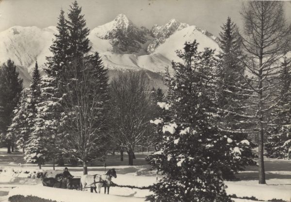 Na pierwszym planie sanie z końmi w zimowej scenerii w miejscowości Tatrzańska Łomnica. W tle Łomnica i Kieżmarski Szczyt.