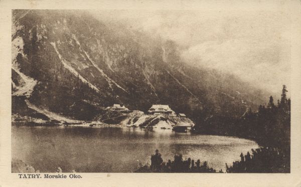 Schronisko nad Morskim Okiem w Dolinie Rybiego Potoku. Z lewej widoczne Schronisko Burowej. Pod zdjęciem wydrukowany tytuł.