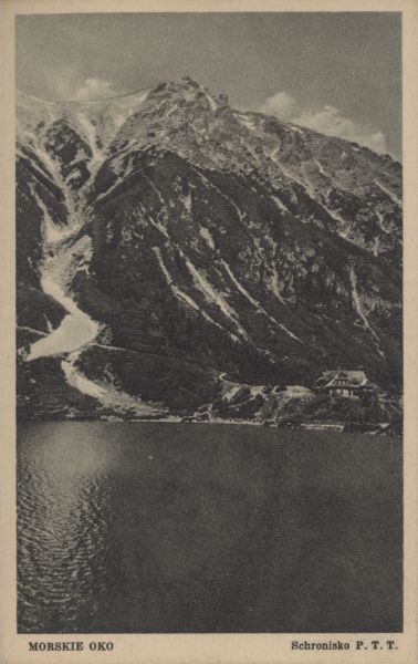 Morskie Oko w Dolinie Rybiego Potoku. Z prawej nad brzegiem widoczne schronisko. W tle Opalony Wierch. Pod zdjęciem wydrukowany tytuł.