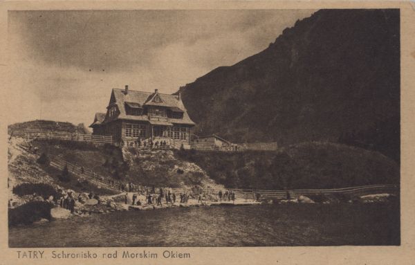 Schronisko nad Morskim Okiem w Dolinie Rybiego Potoku. Nad brzegiem widoczna przystań i turyści. Pod zdjęciem wydrukowany tytuł.