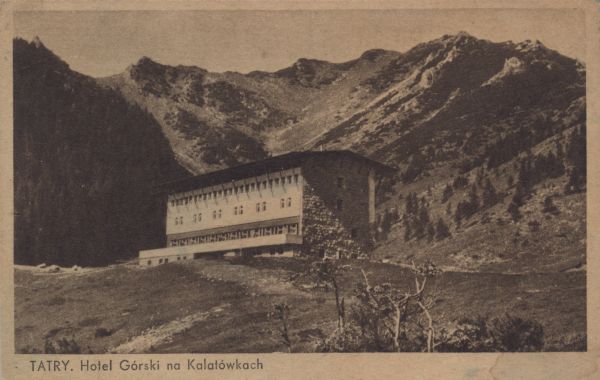 Hotel górski na Kalatówkach. W tle Suchy Żleb. Pod zdjęciem wydrukowany tytuł.