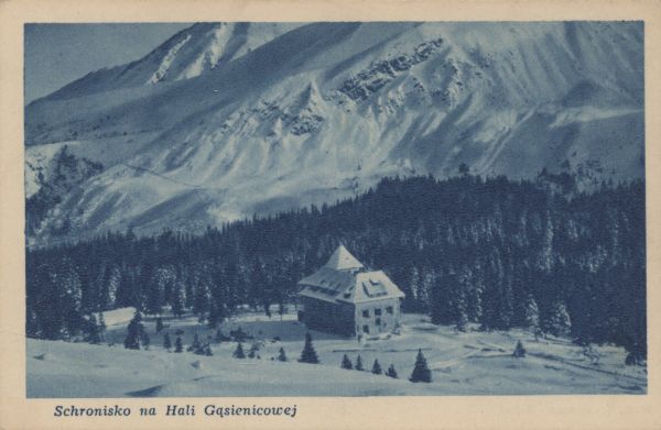 Schronisko Murowaniec na Hali G±sienicowej w zimie. Pod zdjęciem wydrukowany tytuł.