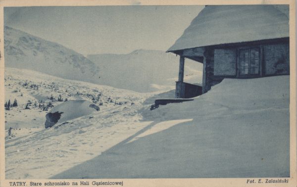 Stare schronisko na Hali G±sienicowej w zimie. Pod zdjęciem wydrukowany tytuł i nazwisko fotografa.