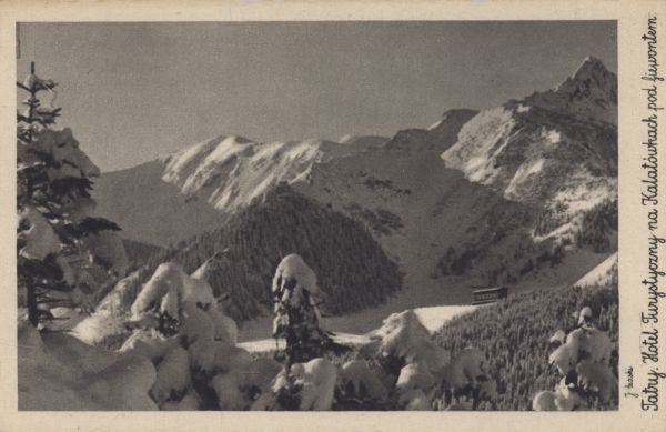 Hotel górski na Kalatówkach w zimie. W tle z prawej Giewont. Na marginesie po prawej stronie wydrukowane nazwisko fotografa i tytuł.