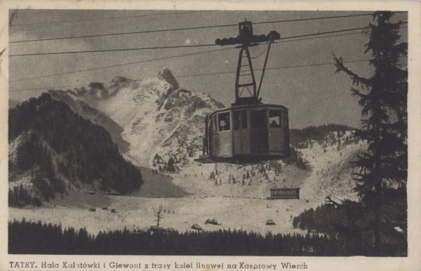 Wagonik kolei linowej na Kasprowy Wierch. W tle hotel górski na Kalatówkach i Giewont zimą. Pod zdjęciem wydrukowany tytuł.
