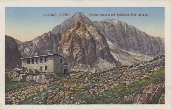 Schronisko Téryego w Dolinie Pięciu Stawów Spiskich. W tle Lodowy Szczyt. U góry wydrukowany tytuł.