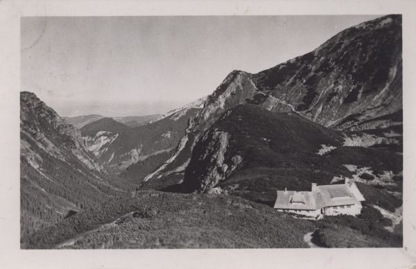 Widok na schronisko w Dolinie Pięciu Stawów Polskich. W tle z lewej Dolina Roztoki. Nad schroniskiem Świstówka Roztocka.