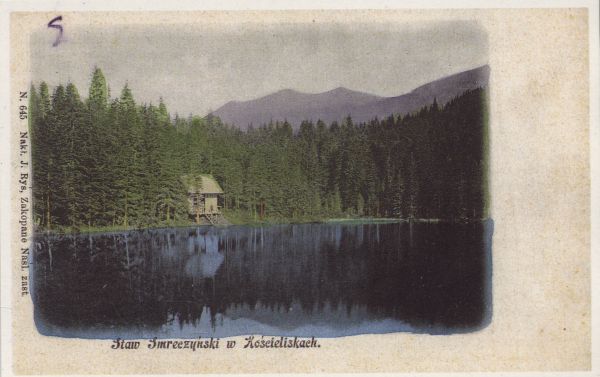 Altana nad Smreczyńskim Stawem w Dolinie Kościeliskiej. Pod zdjęciem wydrukowany tytuł, na marginesie po lewej stronie nakładca.