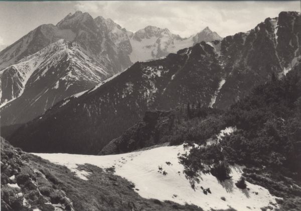 Pohµad z Belanských Tatier: Zµava: Huncovský ątít (2353 m), Lomnický ątít (2634 m), Keľmarský ątít (2556 m), Malý Keľmarský ątít (2524 m), Laątovičia veľa (2625 m), Pyąný ątít (2595 m), Baranie sedlo (2350 m) a Baranie rohy (2536 m).