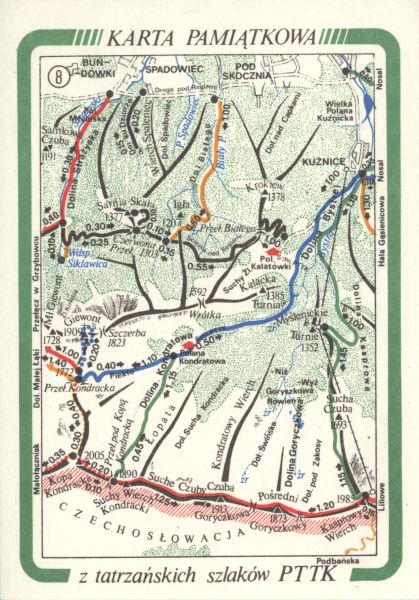 Karta pamiątkowa z tatrzańskich szlaków PTTK - szkic mapy okolic Doliny Bystrej i Giewontu.