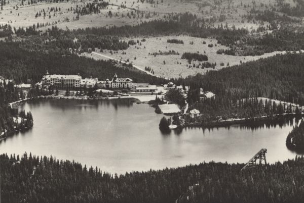 Widok na Szczyrbskie Jezioro ze zbocza Soliska. Nad brzegiem hotele Krywań i Hviezdoslav. W dole z prawej skocznia narciarska.