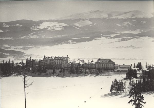 Szczyrbskie Jezioro w zimie. Widok z Soliska na hotele Krywań i Hviezdoslav. W tle Niżne Tatry.