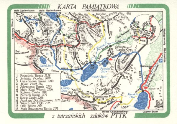 Karta pamiątkowa z tatrzańskich szlaków PTTK - szkic mapy okolic Doliny Pięciu Stawów Polskich.