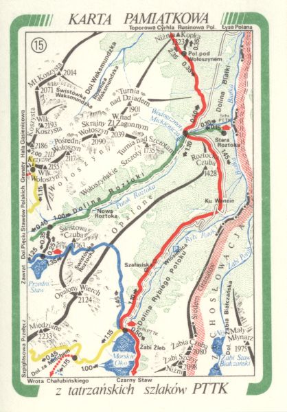 Karta pamiątkowa z tatrzańskich szlaków PTTK - szkic mapy okolic Doliny Roztoki.