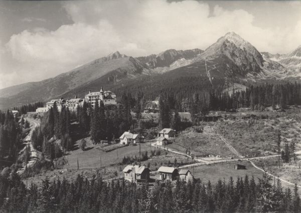 Widok ogólny na Szczyrbskie Jezioro. Z lewej hotele Krywań i Hviezdoslav. W tle Krywań, Siodełko Furkotne, Ostra i Solisko.