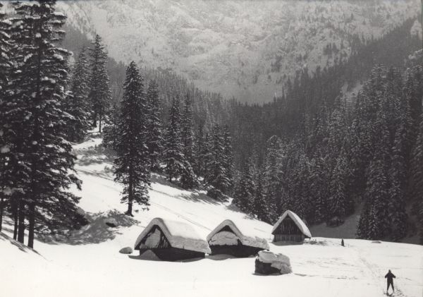 Szałasy na Polanie Strążyskiej w zimie. Z prawej widoczny narciarz.