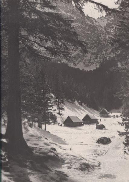 Szałasy na Polanie Strążyskiej w zimie. Z prawej widoczni narciarze.