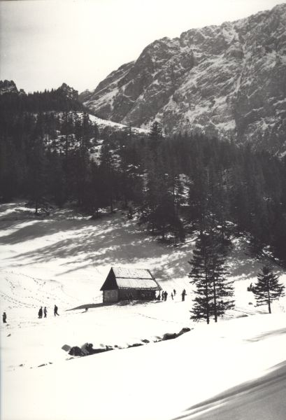 Szałas na Polanie Strążyskiej w zimie. Obok widoczni narciarze i turyści.