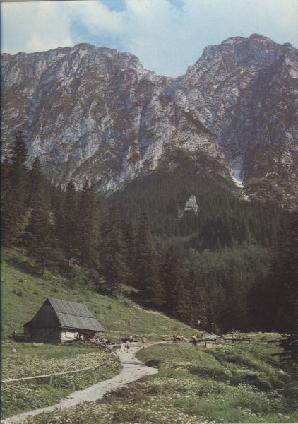Turyści przy herbaciarni na Polanie Strążyskiej. W tle Giewont.