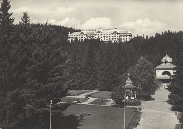 Na pierwszym planie park i altana przed budynkiem Grand Hotelu Praga w miejscowości Tatrzańska Łomnica.